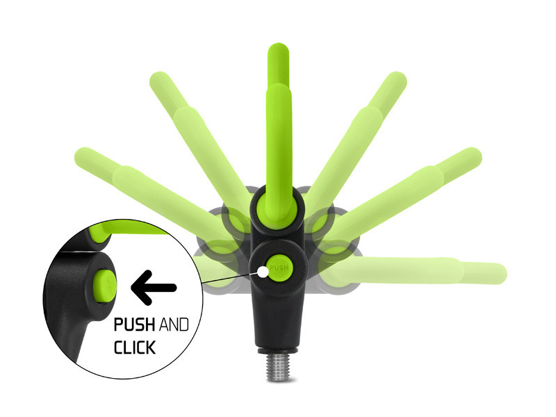 Az „L” alakú elülső tartó nagyszerű eszköz minden feederhorgász számára. Segítségével a bot a tartóban marad még erős kapás esetén is. Az alján található szerkezet segít a kívánt dőlésszög beállításában. 17 cm széles. Univerzális menettel rendelkezik, amely kompatibilis a legtöbb leszúróval és bottartóval a piacon. A zöld és fekete szín tökéletesen passzol a REAXE feeder sorozathoz.