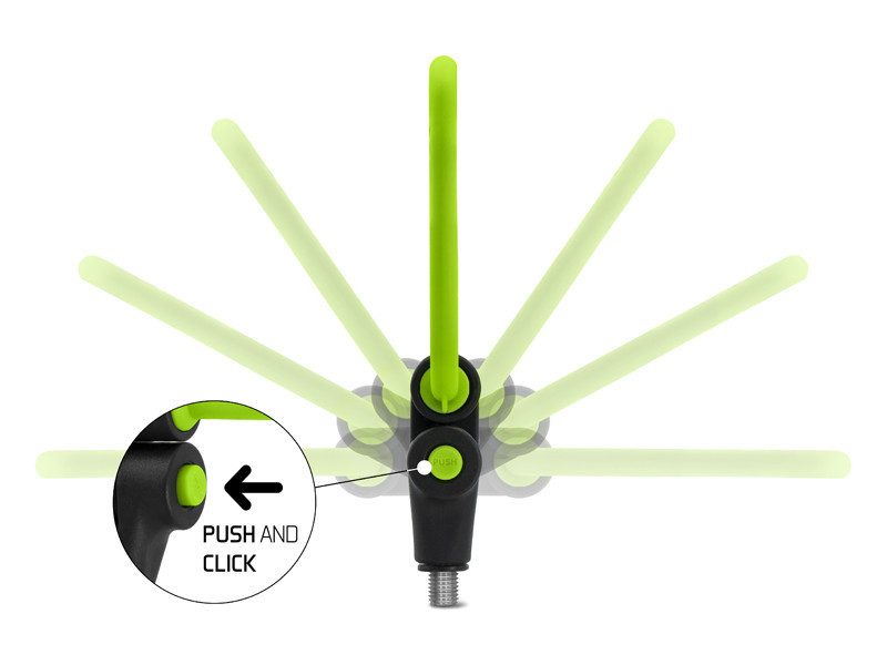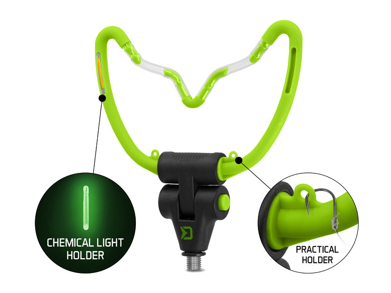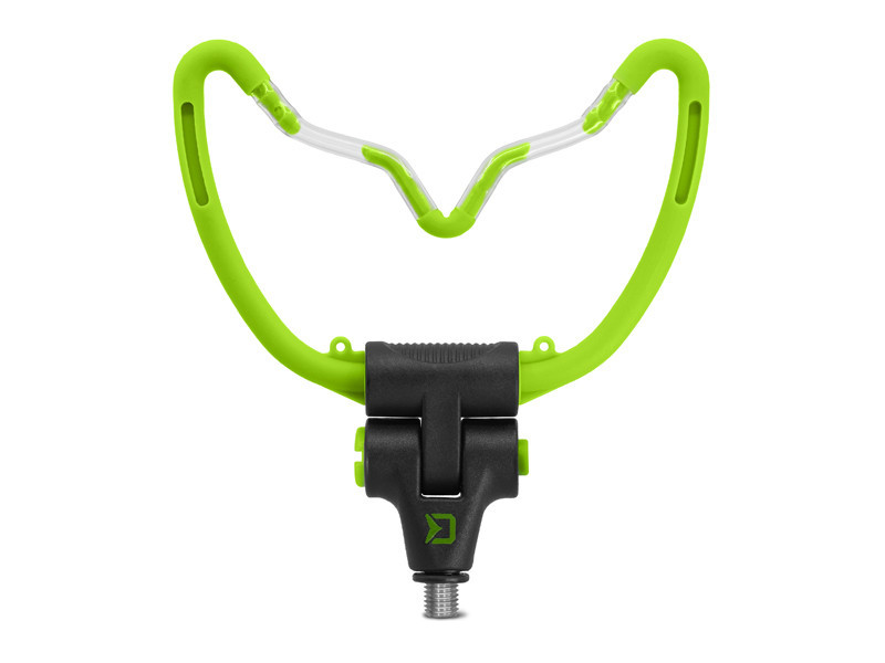 A Delphin REAXE „V” alakban egy sokoldalú, megbízható és biztonságos bottartó. Formája sima zsinórfutást garantál kapás esetén. Az alján található mechanizmus segít a kívánt dőlésszög beállításában. 14,5 cm széles. Az etetőkosár megtöltésekor a horog rögzítésére szolgáló hurkok, a tartó hasznos kiegészítői. Ezenkívül 4 nyílással rendelkezik a világítópatronok számára, a kényelmes éjszakai horgászathoz. Univerzális menettel rendelkezik, amely kompatibilis a legtöbb leszúróval és bottartóval a piacon. A zöld és fekete szín tökéletesen passzol a REAXE feeder sorozathoz.